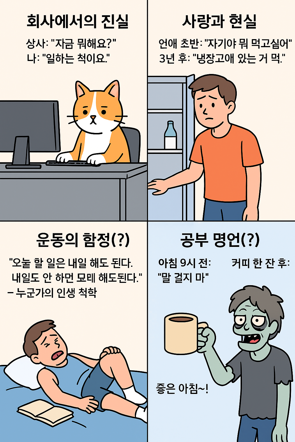 눈 반쯤 감은 좀비 캐릭터가 커피 마신 뒤 번쩍 눈 뜨는 그림